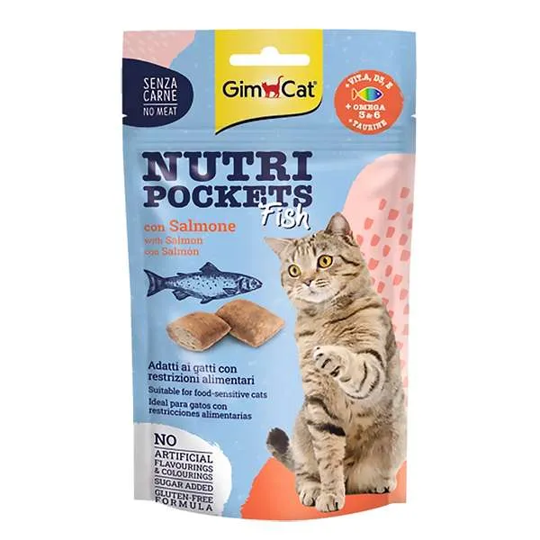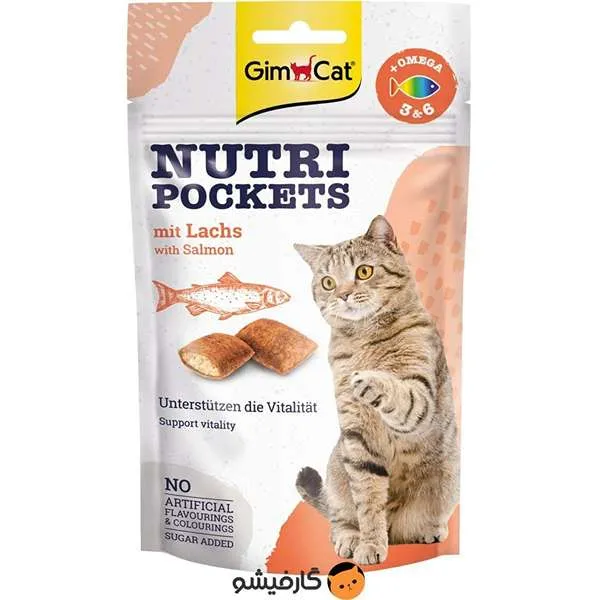 اسنک تشویقی نوتری گربه جیم کت با طعم سالمون و ماهی GimCat Nutri Pockets salmon fish وزن ۶۰ گرم